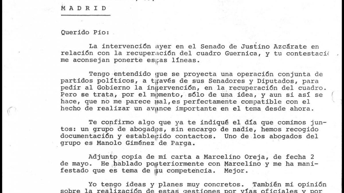 Carta dirigida al ministro de Cultura sobre la intervención en el Senado de Justino Azcárate y las gestiones con los abogados sobre la propiedad del cuadro. Adjunta la carta que le envió a Marcelino Oreja el 2 de mayo de 1977.
