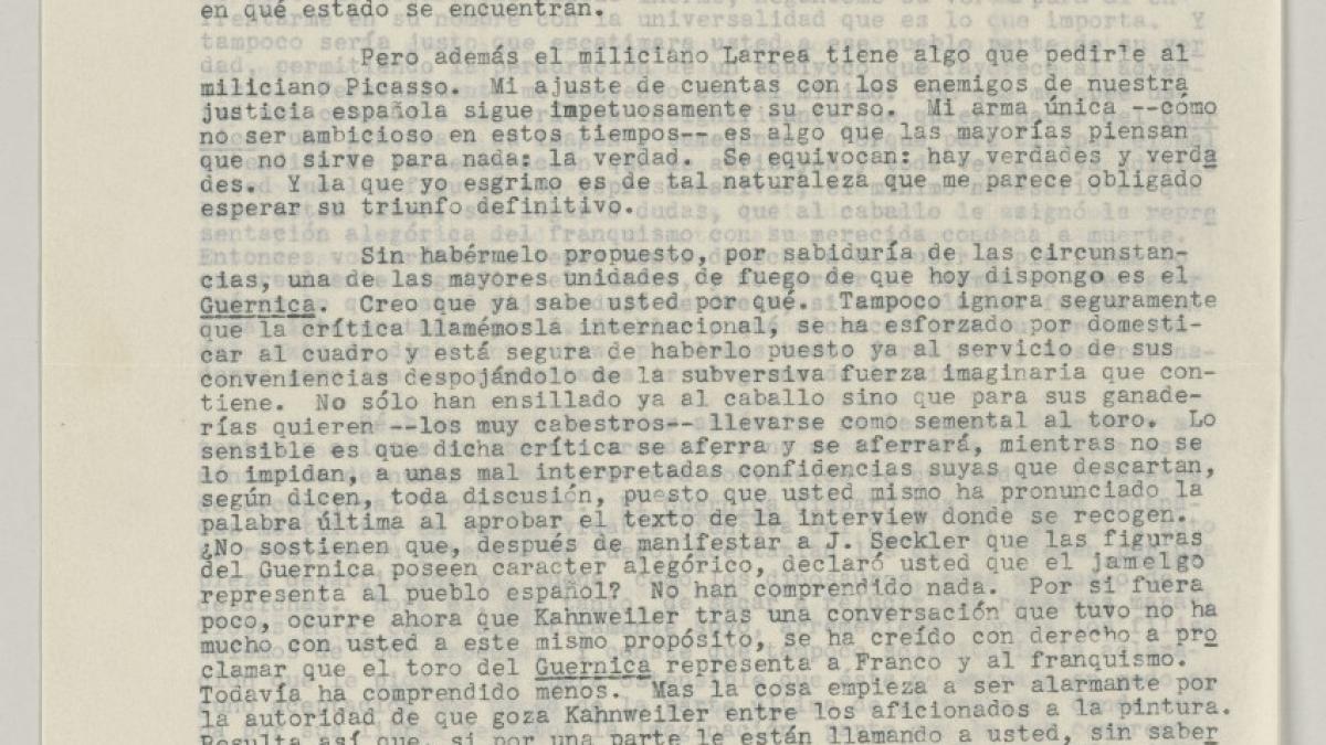 Juan Larrea pide a Pablo Picasso que rectifique lo que Daniel-Henry Kahnweiler ha dicho sobre Guernica. Incluye una hoja con tres aclaraciones del propio Picasso sobre cómo el caballo representa el franquismo y otra hoja con preguntas sobre la interpretación.