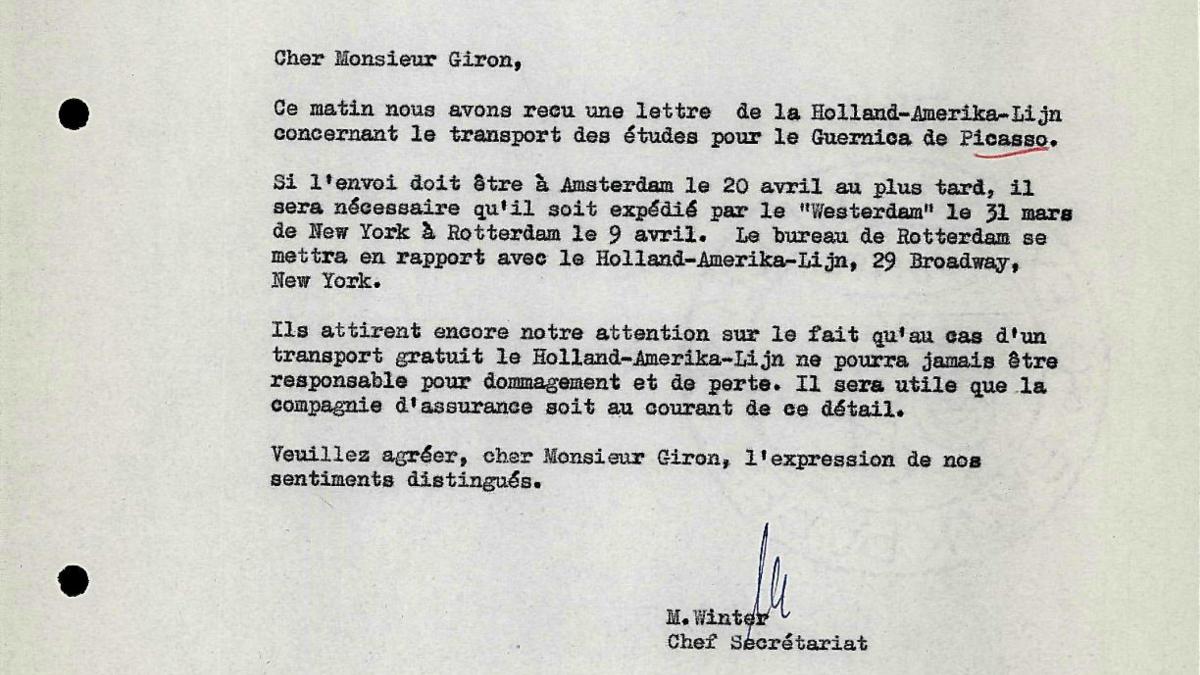 M. Winter, secretaria de dirección del Stedelijk Museum, informa a Robert Giron, director del Palais des Beaux-Arts de Bruselas, de las fechas de envío de los estudios de Guernica de Nueva York a Róterdam.