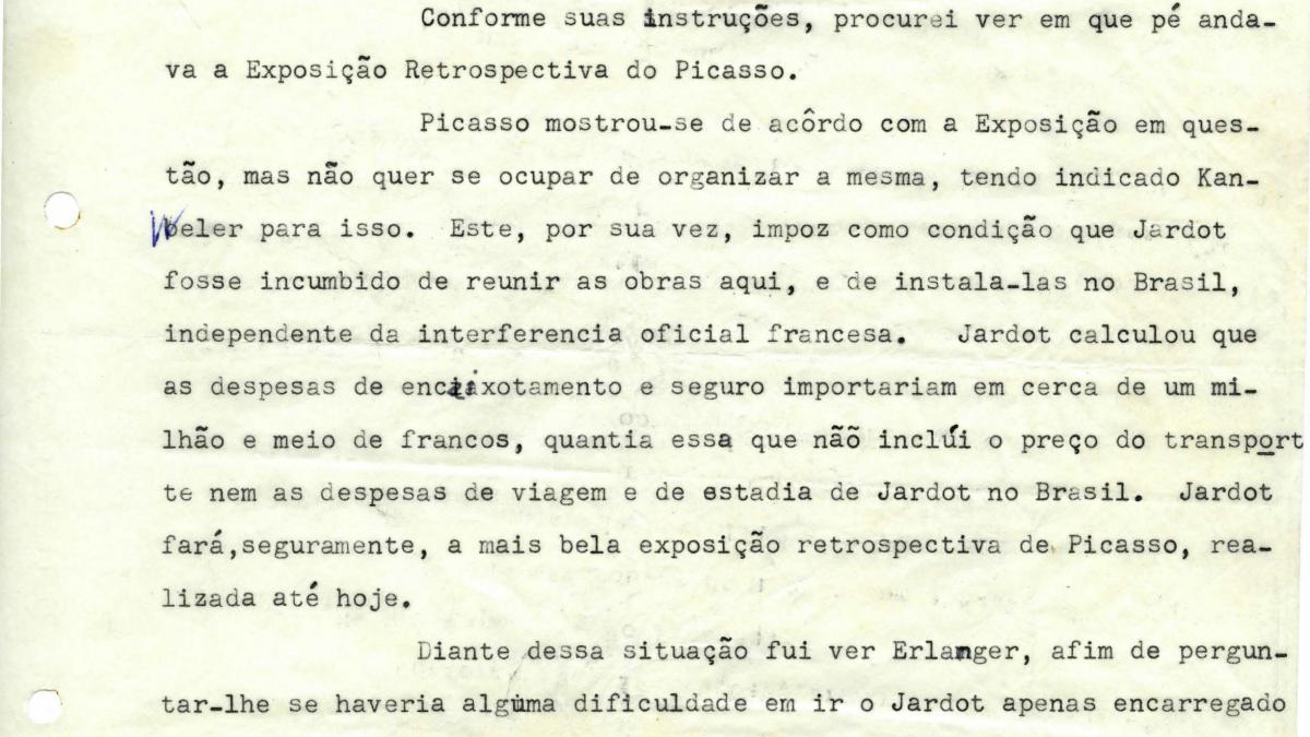 La artista brasileña Maria Martins informa a Francisco Matarazzo Sobrinho, presidente de la Bienal de São Paulo, del encuentro con Pablo Picasso, quien se muestra conforme con la exposición de su obra, pero nombra a Daniel-Henry Kahnweiler para organizarla. Este a su vez impone la condición de que sea Maurice Jardot quien se encargue de reunir las obras y preparar la retrospectiva.