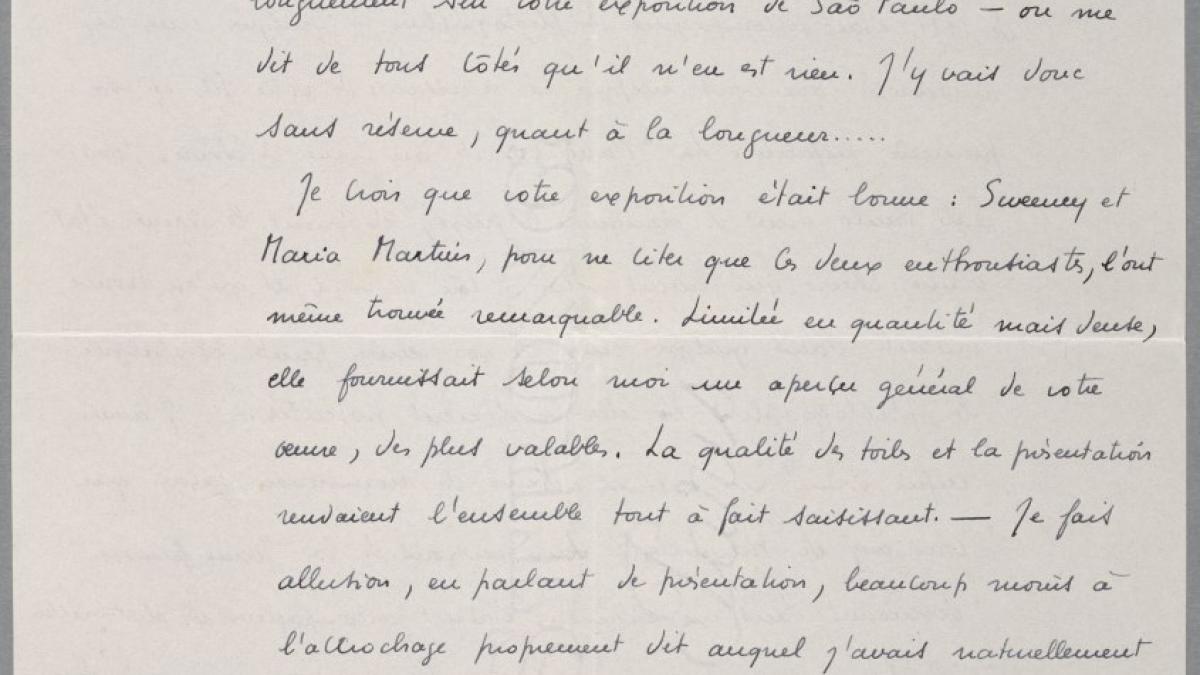 Maurice Jardot escribe a Pablo Picasso acerca de su exposición en la II Bienal de São Paulo y el préstamo de Guernica.