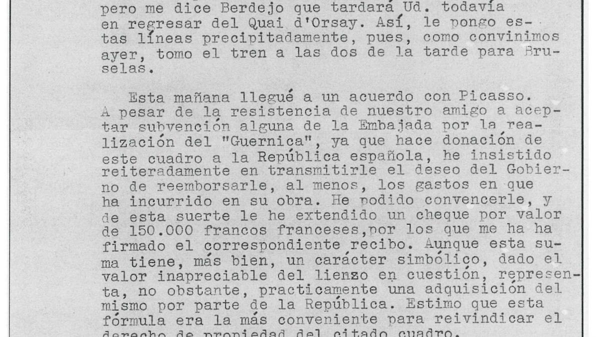 El escritor y político Max Aub, agregado cultural de la Embajada de España en París, comunica al embajador, Luis Araquistáin, que ha conseguido extender a Pablo Picasso un cheque por valor de 150 000 francos para cubrir los gastos de realización del cuadro a pesar de la insistencia del artista en donar el cuadro a la República. Aub explica que contar con un recibo firmado por Picasso es la mejor manera de probar la propiedad del lienzo e informa a Araquistáin de la invitación de Picasso a ambos a visitar su taller y cenar con él.