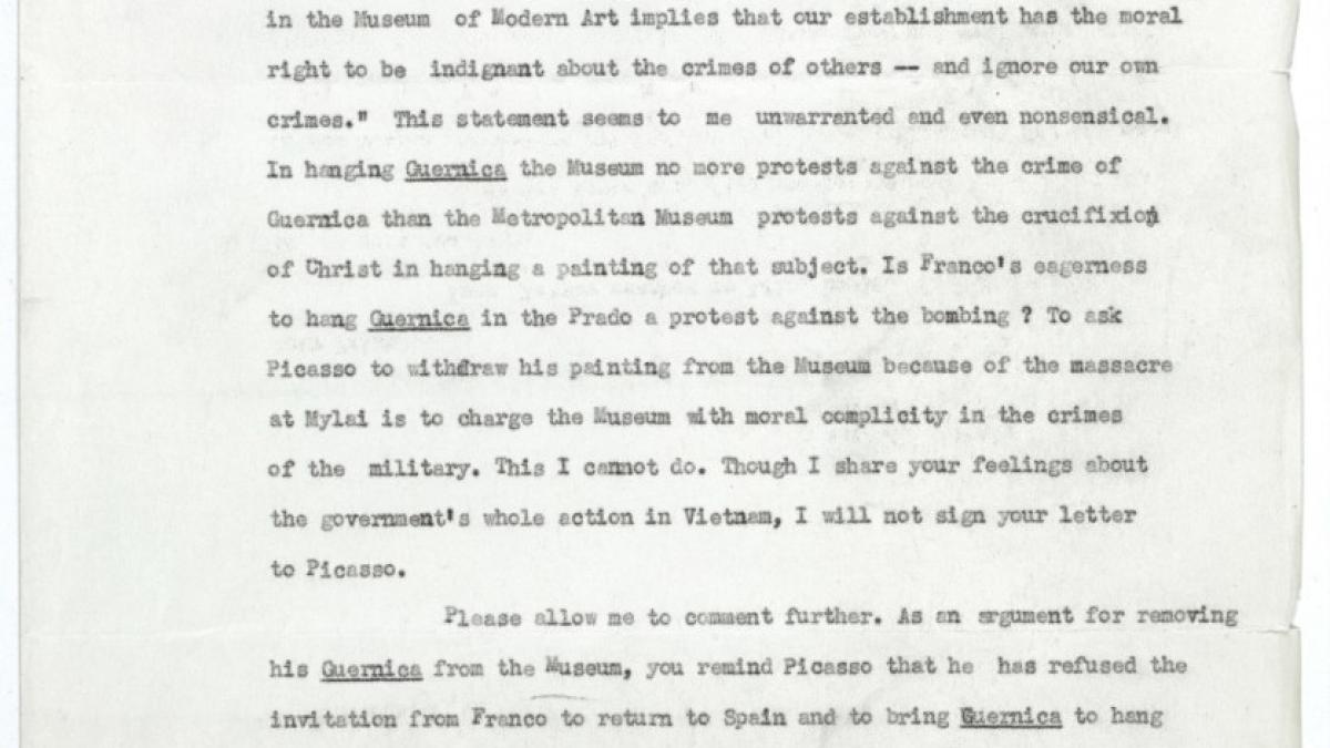 El historiador del arte Meyer Schapiro transmite al colectivo Art Workers' Coalition su desacuerdo con la petición de retirar Guernica del Museum of Modern Art de Nueva York como protesta contra la guerra de Vietnam.