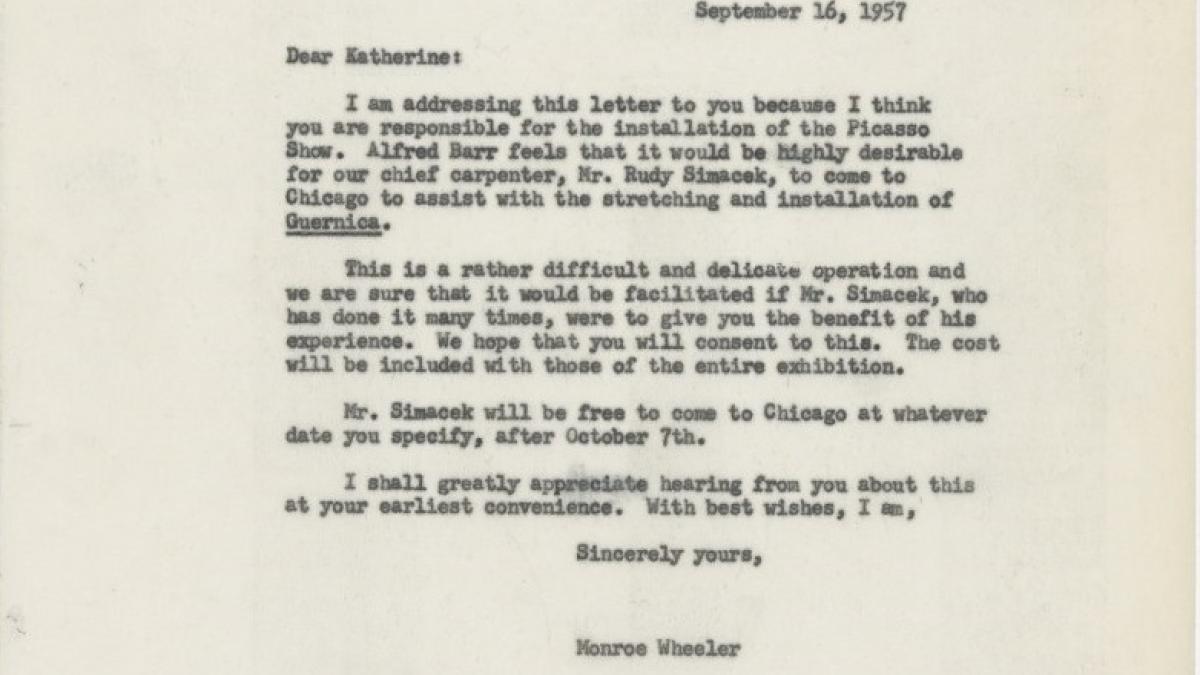 Monroe Wheeler, director de Exposiciones y Publicaciones del Museum of Modern Art de Nueva York, comunica a Katharine Kuh, conservadora del Art Institute of Chicago, que enviarán su propio carpintero para el montaje de Guernica.