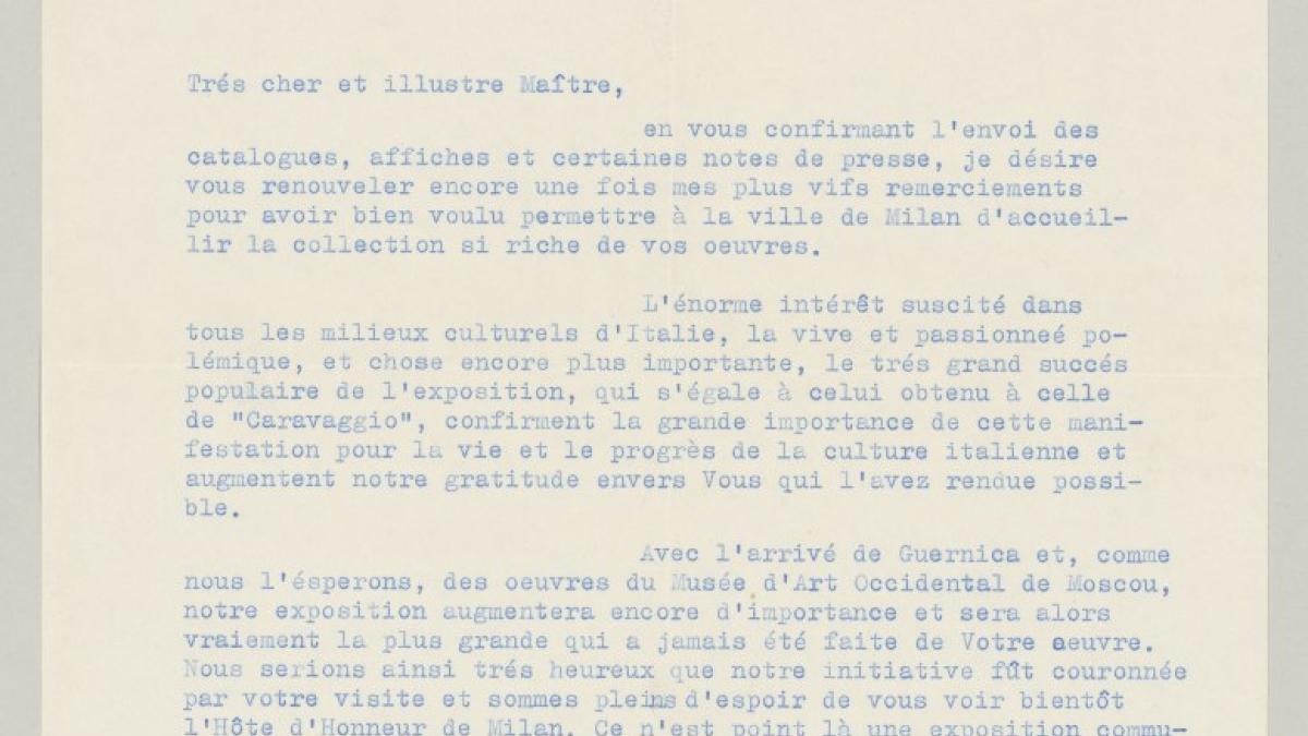 Paolo d'Ancona, presidente del comité de la exposición de Pablo Picasso en el Palazzo Reale de Milán, escribe a Pablo Picasso para informarle del envío de fotos, recortes de prensa y folletos en relación a la muestra y agradecerle que haya hecho posible su celebración, en especial por el préstamo de Guernica.