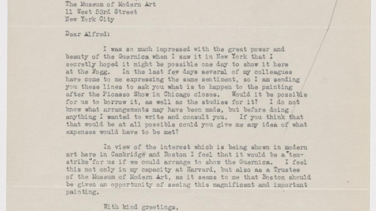 Paul Sachs, director del William Hayes Fogg Art Museum, de la Universidad de Harvard, pide prestado a Alfred H. Barr Jr., director del Museum of Arte de Nueva York, Guernica para exponerlo en el museo.