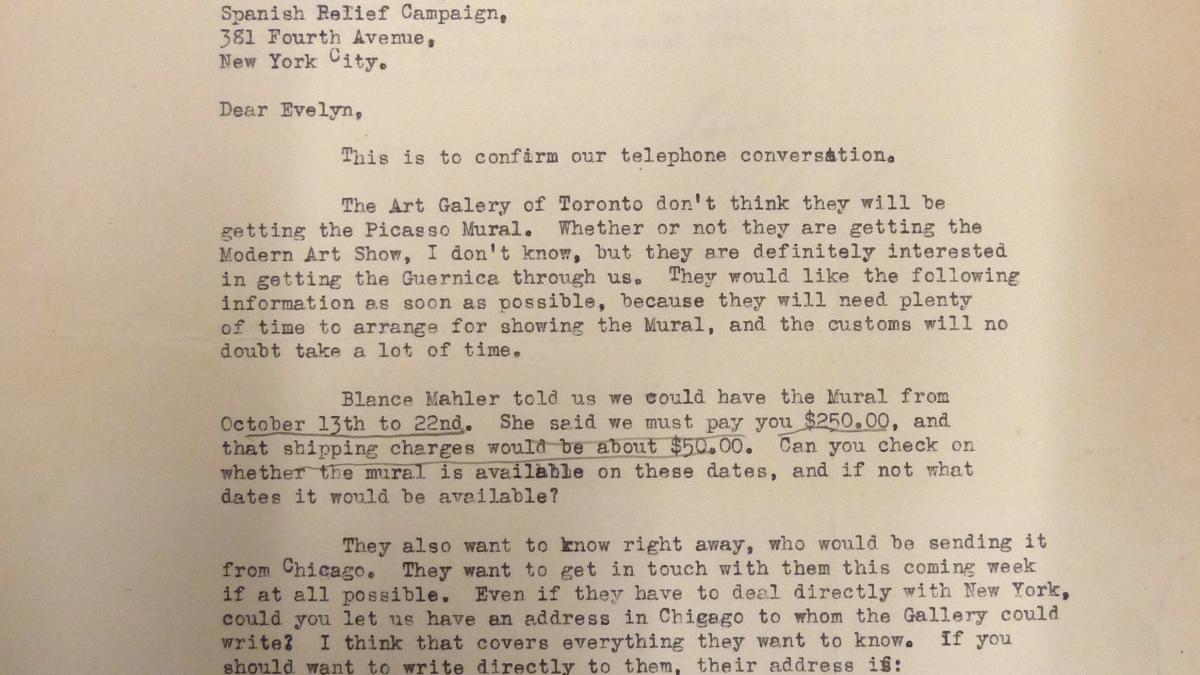 Phyllis Lane, del Canadian Committee to Aid Spanish Refugees, escribe a Evelyn Ahrend, directora de la Oficina de Programas de la Spanish Refugee Relief Campaign, sobre la posibilidad de llevar la exposición a Toronto Picasso's Guenica, algo que no cree que ocurra, así como otras cuestiones sobre los niños españoles refugiados y familias de acogida.