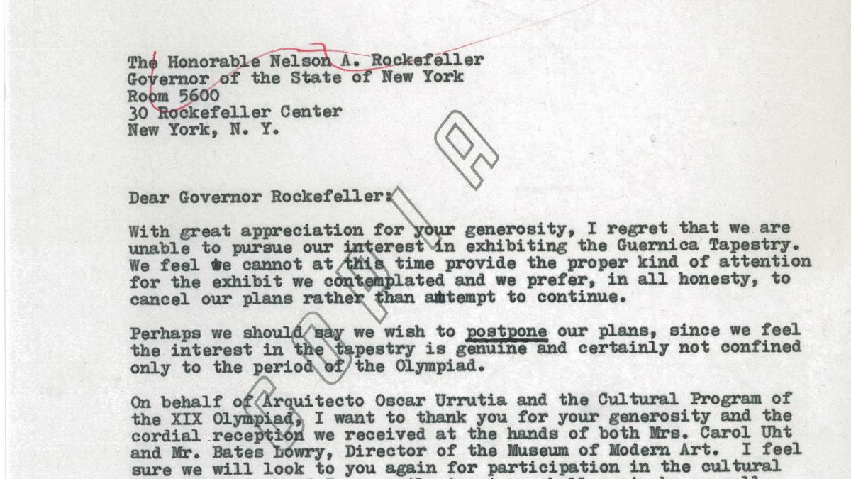 Rachmael ben Avram, coordinador del servicio de prensa internacional de los Juegos Olímpicos de México 1968, comunica a Nelson Rockefeller la cancelación de los planes de exponer la réplica de Guernica en tapiz en las Olimpiadas al no poder asegurar las medidas de seguridad necesarias.
