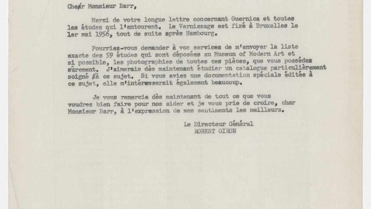 Robert Giron, director del Palais des Beaux-Arts de Bruselas, pide a Alfred H. Barr Jr., director del Departamento de Colecciones del Museum of Modern Art de Nueva York, la lista de las 59 obras que le comenta y fotografías de cada una de ellas.