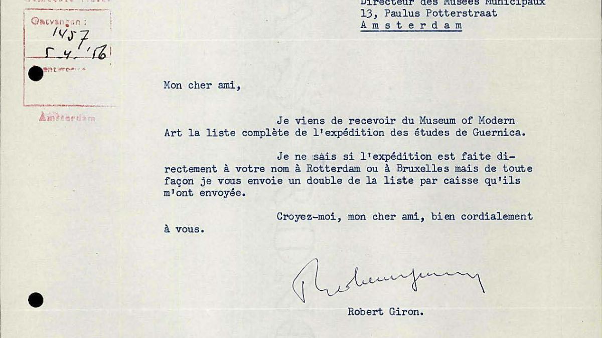 Robert Giron, director del Palais des Beaux-Arts de Bruselas, escribe a Willem Sandberg, director del Stedelijk Museum, sobre el envío de los estudios de Guernica.