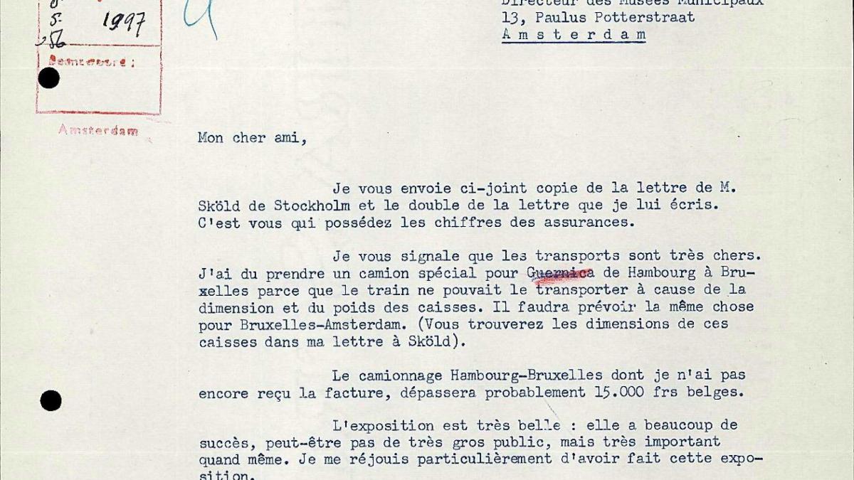 Robert Giron, director del Palais des Beaux-Arts de Bruselas, escribe a Willem Sandberg, director del Stedelijk Museum, acerca del transporte de la exposición y le adjunta una copia de una carta a Otte Sköld, director del Nationalmuseum de Estocolmo.