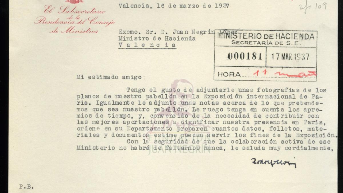 Carta de Rodolfo Llopis, subsecretario de la Presidencia del Consejo de Ministros, a Juan Negrin, Ministro de Hacienda, por la que le adjunta unas fotografías con los planos del Pabellón de España, así como el propósito de estar presentes en la Exposición Internacional de París.