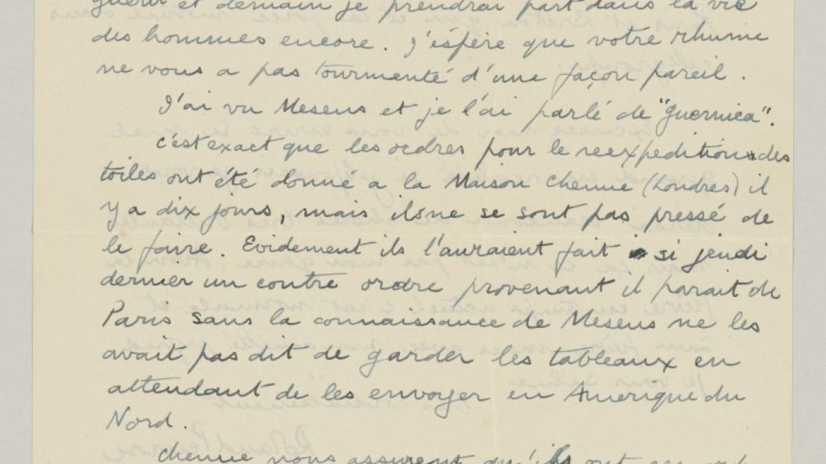 Roland Penrose informa a Pablo Picasso de que ha hablado con E. L. T. Mesens acerca del envío de los cuadros de Londres a París.