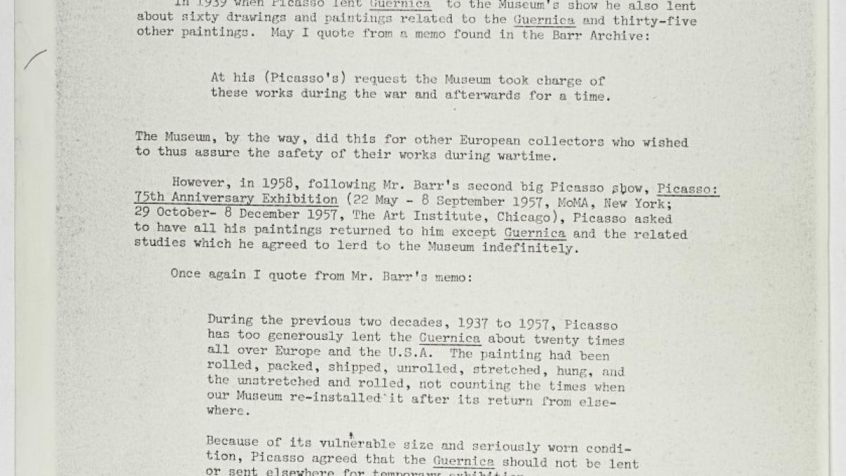 Rona K. Roob, jefa del archivo del Museum of Modern Art de Nueva York, escribe a Carleton Sprague Smith, secretario del Spanish Institute, respondiendo a su carta en el que relata la historia de Guernica y las exposiciones en las que ha participado, entre otras cuestiones.