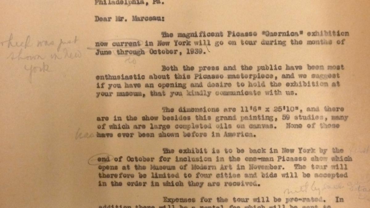 Sidney Janis, director del Comité organizador de la exposición Picasso's Guernica para el Spanish Refugee Relief Campaign, habla a Henri Marceau, ayudante de dirección del Pennsylvania Museum of Art, de la exposición y le ofrece a participar en la gira.