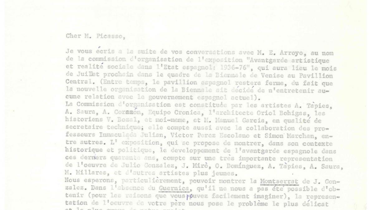 Carta de Tomàs Llorens a Claude Picasso en el contexto de la Bienal de Venecia de 1976