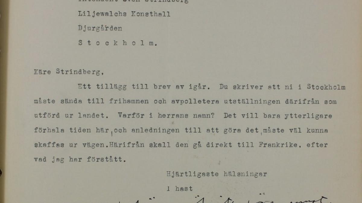 Tor Bjurstöm, director del Goteborgs Konstforening, se dirige a Sven Strindberg, director del Liljevalchs Konsthall de Estocolmo, para abordar el problema de fijar las fechas de la exposición Matisse, Picasso, Braque y Laurens para su sede, apelando a la urgencia de cerrar la itinerancia.