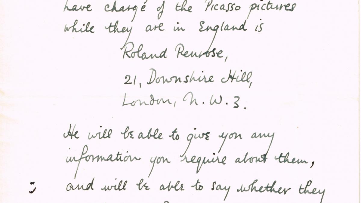 W. J. A. Busby responde a J.N. Duddington, director de la Whitechapel Art Gallery, con el contacto de Roland Penrose, quien está a cargo de las obras de Picasso mientras están en Londres e informará de las posibilidades de préstamo.