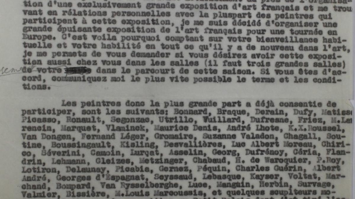 Wasily Levi escribe a Sven Strindberg, director del Liljevalchs Konsthall de Estocolmo, para informarle de que está organizando una nueva exposición de arte moderno francés y espera que él y su institución estén interesados. Incluye también la lista de artistas con los que ha contactado y quiere contar.