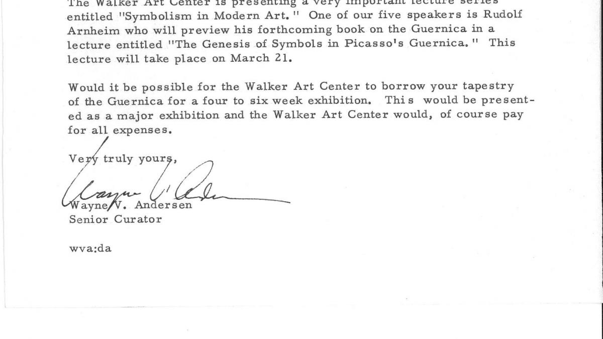 Wayne W. Andersen, del Walker Art Center, pide prestado a Nelson Rockefeller la réplica de Guernica en tapiz para la exposición Symbolism in Modern Art.