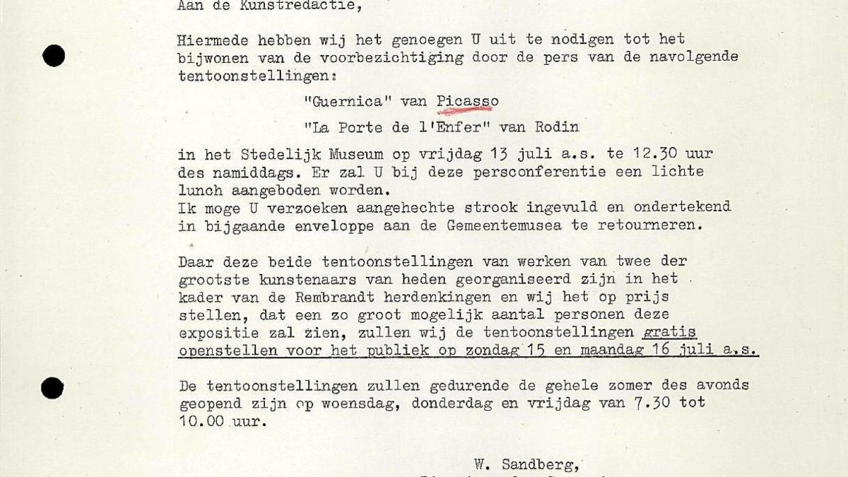 Invitación a la inauguración de la exposición celebrada entre el 14 de julio y el 30 de septiembre de 1956 en el Stedelijk Museum firmada por su director, Willem Sandberg.