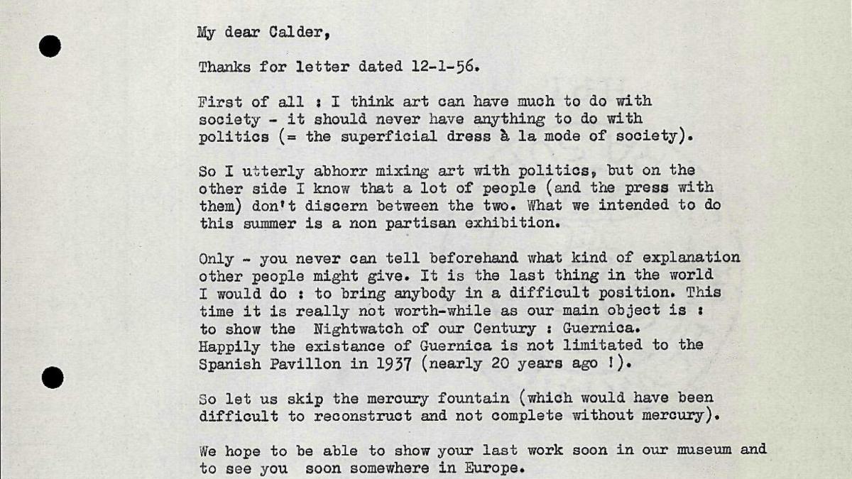 Willem Sandberg, director del Stedelijk Museum, escribe a Alexander Calder acerca de arte y política y descarta la reproducción de Fuente de Mercurio, la escultura del artista para el Pabellón de la República Española de la Exposición Internacional de París de 1937.