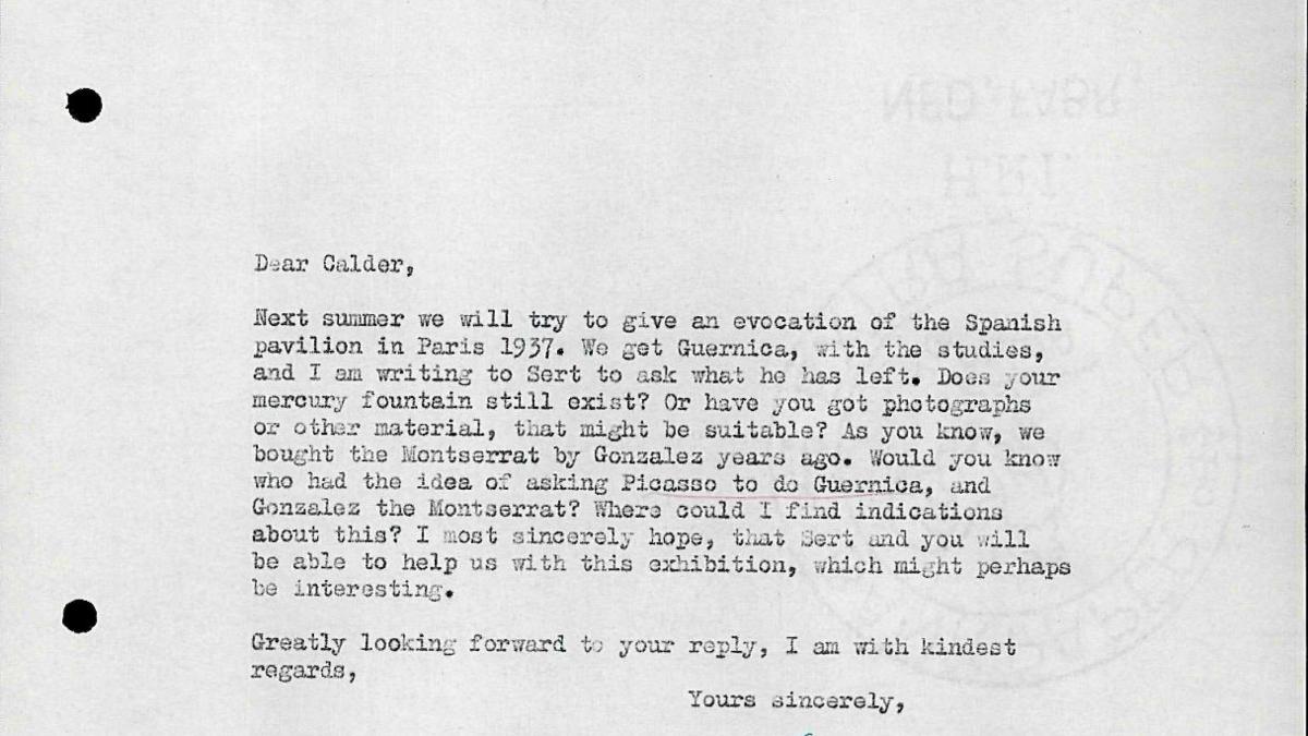 Willem Sandberg, director del Stedelijk Museum, pregunta a Alexander Calder si sigue existiendo Fuente de Mercurio, la obra que realizó para el Pabellón de España en la Exposición Internacional de París de 1937.