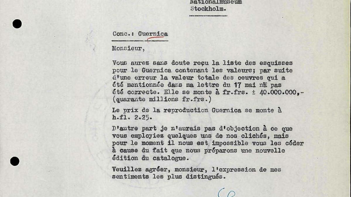 Willem Sandberg, director del Stedelijk Museum, envía a Bo Wennberg, jefe del Departamento de Arte Moderno del Nationalmuseum de Estocolmo, correcciones de algunos de los datos sobre los gastos de la exposición de Ámsterdam que le envió.