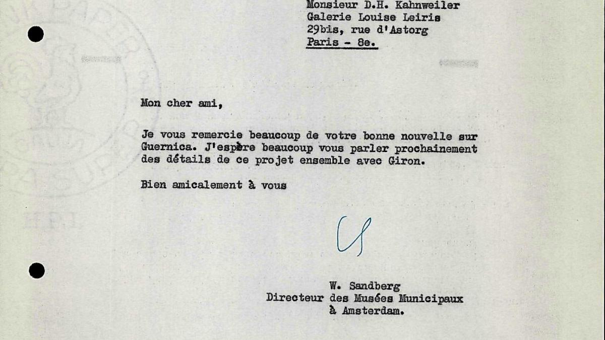 Willem Sandberg, director del Stedelijk Museum, agradece a Daniel-Henry Kahnweiler la noticia sobre el préstamo de Guernica.