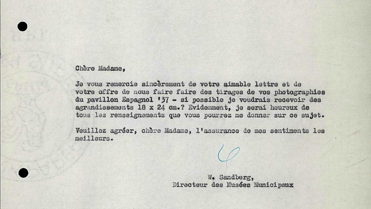 Willem Sandberg, director del Stedelijk Museum, agradece a Dora Maar haber aceptado hacer copias de las fotografías que tomó del Pabellón de España y de las obras de Picasso en particular.