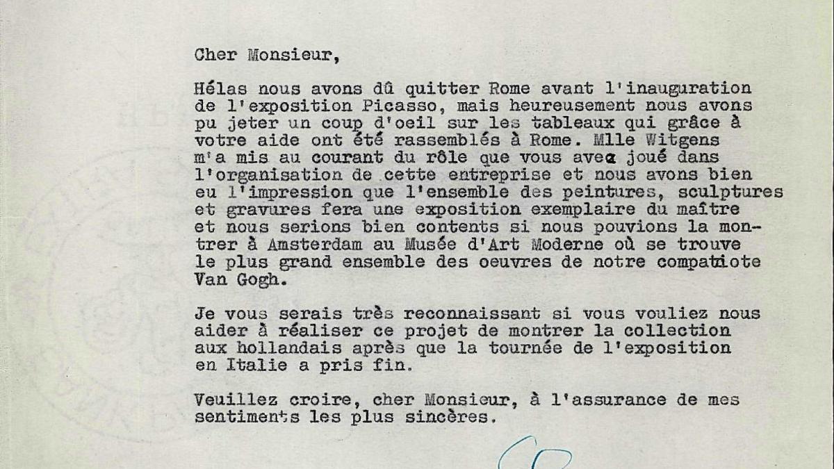 Willem Sandberg, director del Stedelijk Museum, manifiesta su interés por llevar la exposición de Roma a Ámsterdam y pide ayuda al senador Eugenio Reale, senador del Partido Comunista Italiano y miembro del comité organizador de las exposiciones de Roma y Milán.