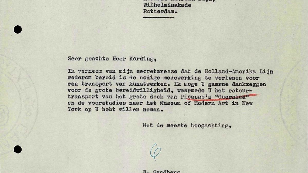 Willem Sandberg, director del Stedelijk Museum, solicita a la empresa Holland-Amerika Lijn que se haga cargo del transporte de Guernica a Nueva York.