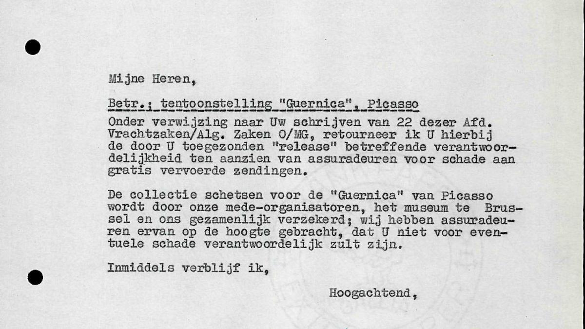 Willem Sandberg, director del Stedelijk Museum, escribe a la empresa de transporte Holland-Amerika Lijn, con cuestiones relativas al envío de Guernica a Ámsterdam y Bruselas.