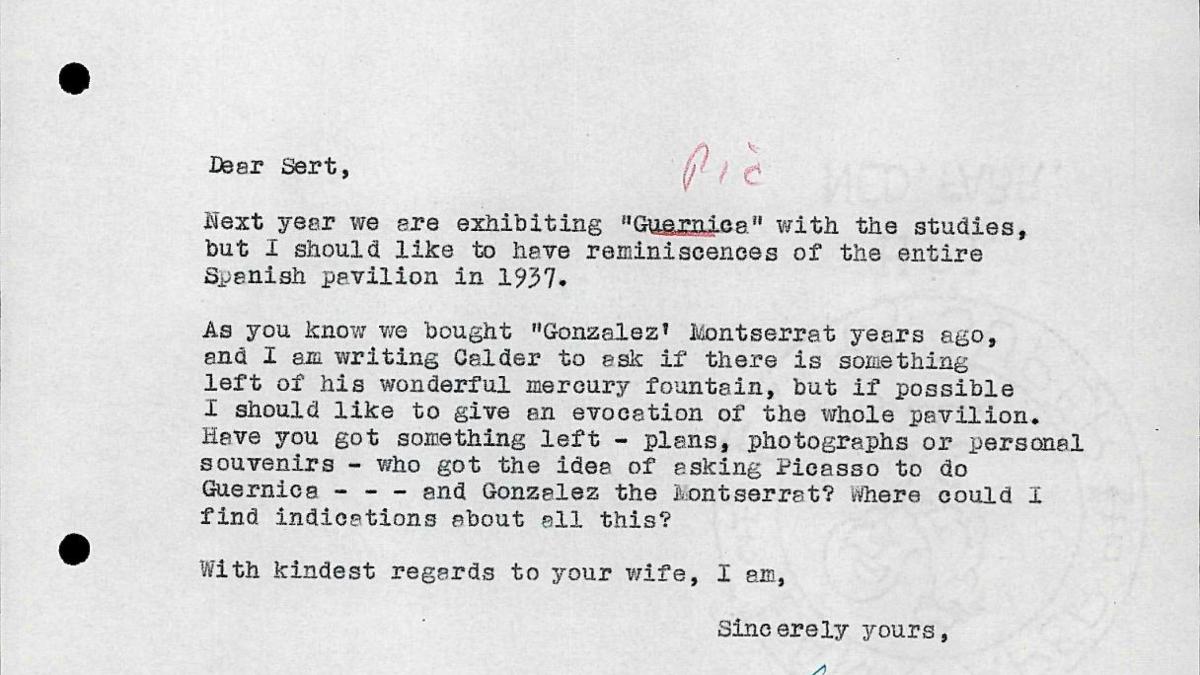 Con motivo de la exposición Guernica, avec 60 études, Willem Sandberg, director del Stedelijk Museum de Ámsterdam, solicita a Josep Lluís Sert, arquitecto que junto con Luis Lacasa proyectó el Pabellón de España en la Exposición Internacional de París de 1937, cualquier material que pueda conservar (planos, fotografías, etc.) para recrear el edificio. Puesto que el museo holandés cuenta en su colección con la escultura Montserrat de Julio González, le pide información acerca de la Fuente de Mercurio de Alexander y le traslada su intención de solicitar el préstamo de Guernica a Picasso.