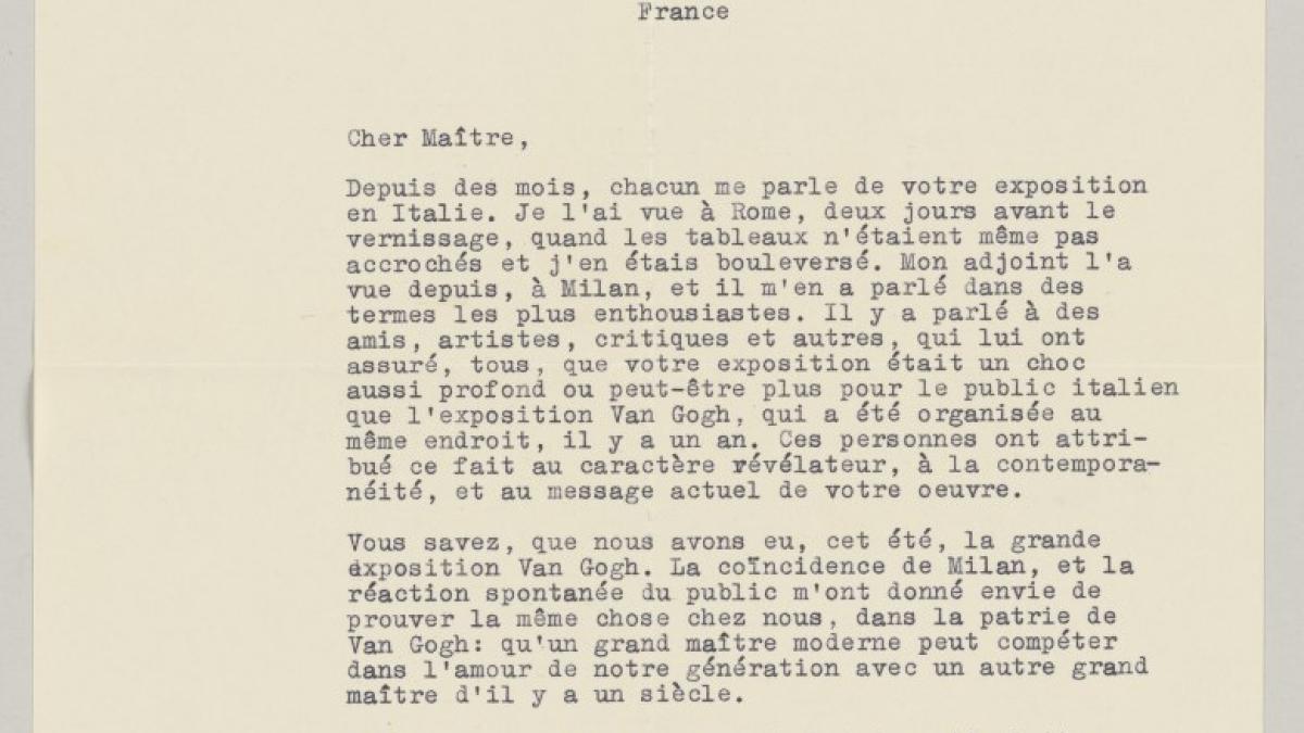 Willem Sandberg, director del Stedelijk Museum de Ámsterdam, escribe a Pablo Picasso para transmitirle el entusiasmo que la exposición celebrada en Italia ha causado tanto en él como en amigos, artistas, críticos y público, que la comparan con la exposición de Van Gogh celebrada en el mismo lugar un año antes. Expresa también su interés por llevar la muestra a su museo donde, afirma, competirá por el amor de su generación con el gran pintor holandés del siglo anterior.