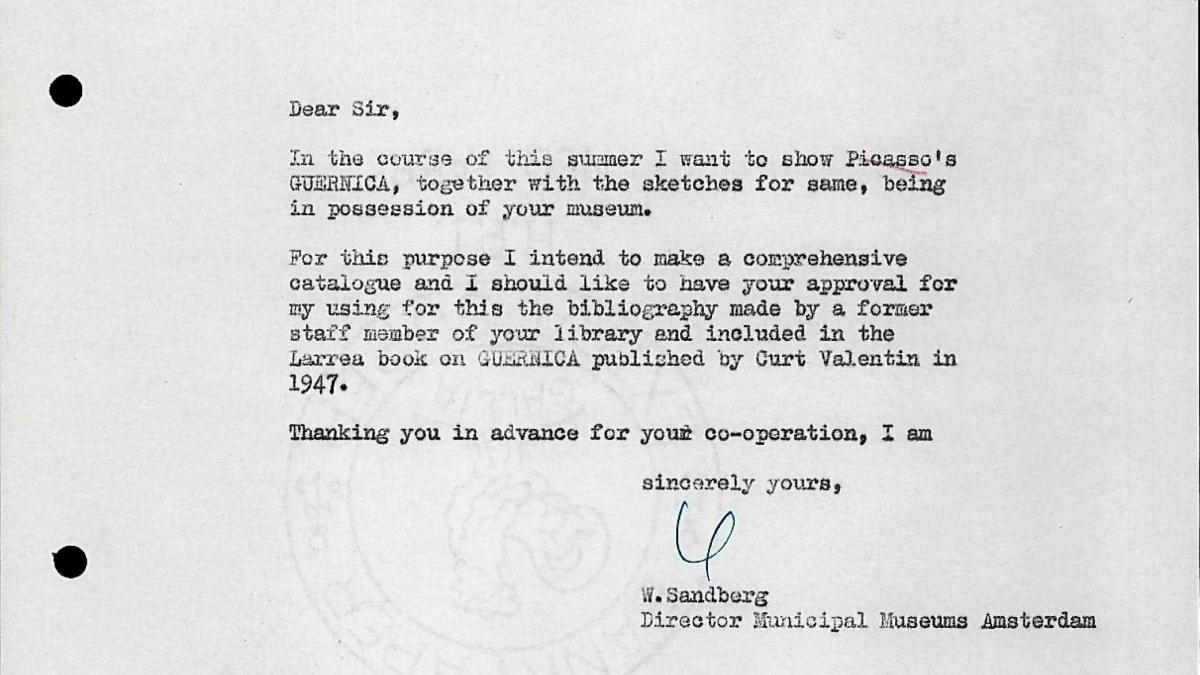 Willem Sandberg, director del Stedelijk Museum, pide a René d'Harnoncourt, director del Museum of Modern Art de Nueva York, un libro para poder realizar un catálogo para la exposición de Ámsterdam.