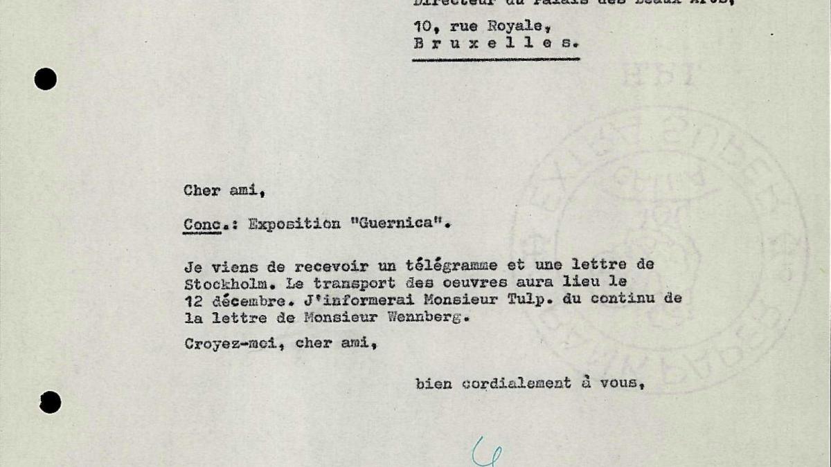 Willem Sandberg, director del Stedelijk Museum, se dirige a Robert Giron, director del Palais des Beaux-Arts de Bruselas, con cuestiones relativas al envío de las obras desde Estocolmo.