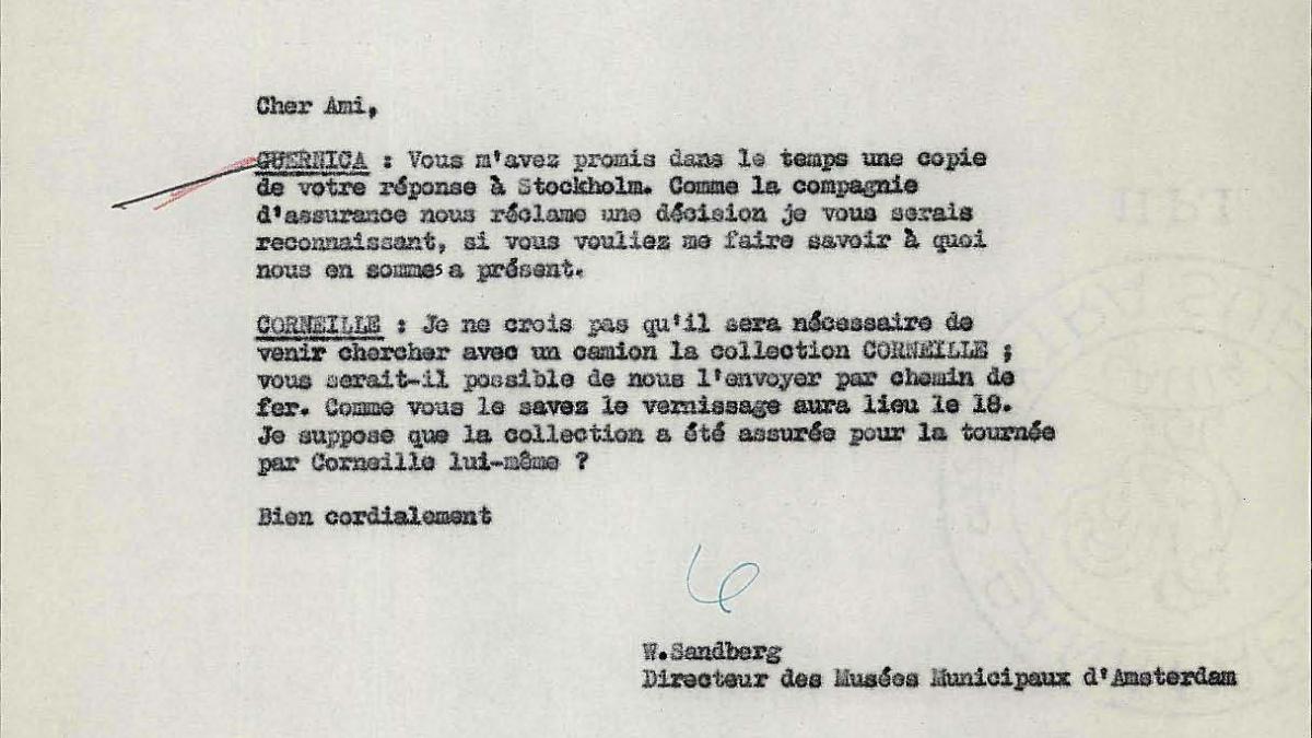 Willem Sandberg, director del Stedelijk Museum, escribe a Robert Giron, director del Palais des Beaux-Arts de Bruselas, con cuestiones sobre Guernica y la colección Corneille.