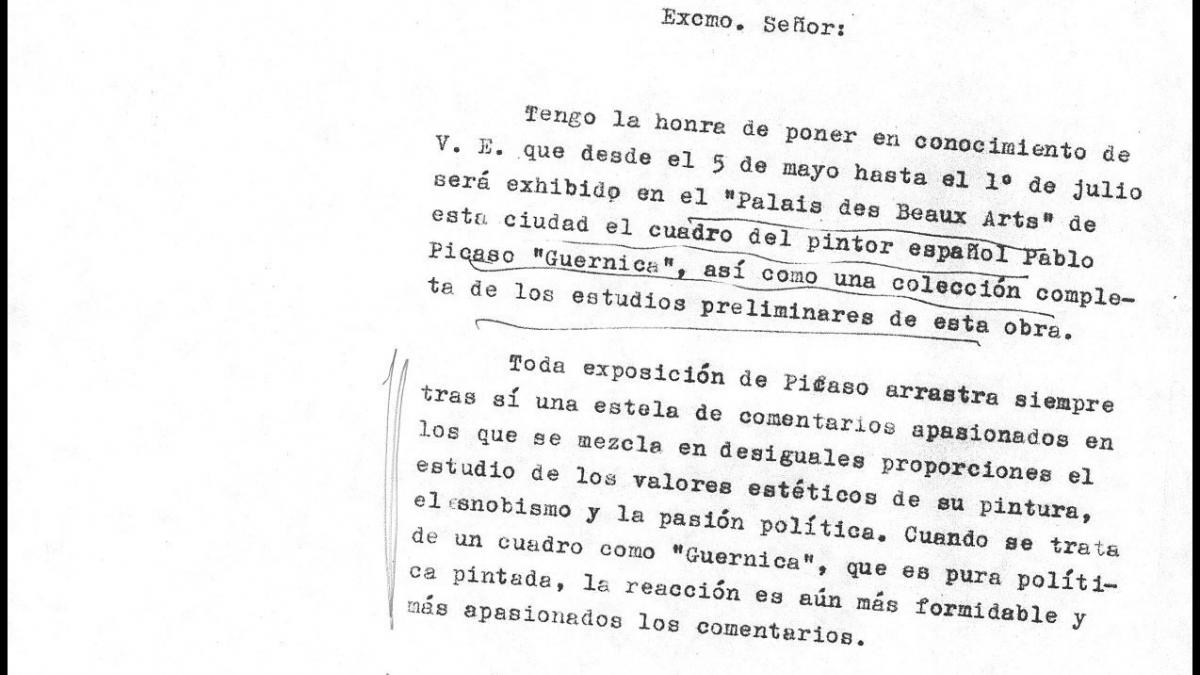 Carta del conde de Casa Miranda, embajador de España en Bélgica, al ministro de Asuntos Exteriores, Alberto Martín-Artajo Álvarez, acerca de la exposición de Picasso en Bruselas en la que adjunta recortes de prensa sobre esta.