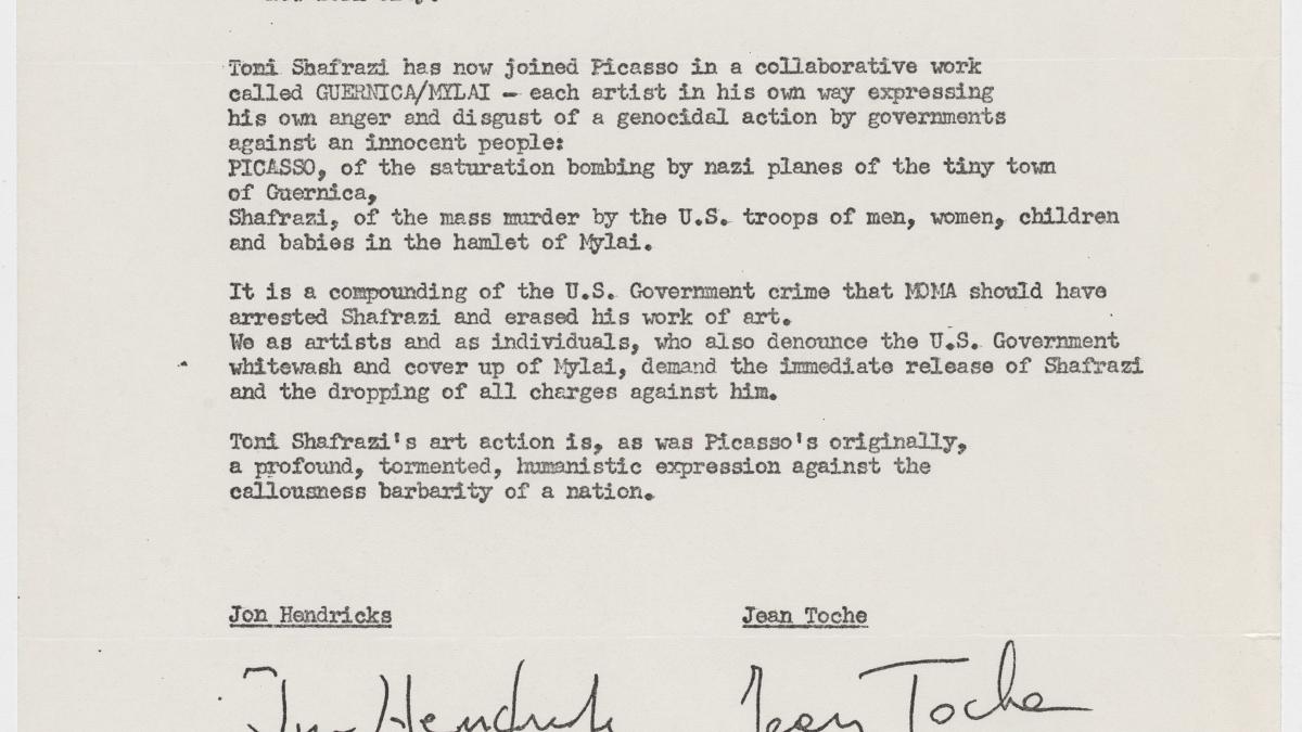 Comunicado del grupo de artistas activistas Guerrilla Art Action Group dirigido al director del Museum of Modern Art de Nueva York en el que se defiende y explica la acción de Toni Shafrazi, artista que escribió «Kill Lies All» en el centro de Guernica con un aerosol el 28 de febrero de 1974, como protesta contra el bombardeo estadounidense de la aldea vietnamita de My Lai.