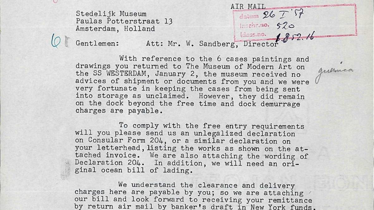El vicepresidente de la empresa de transporte W. R. Keating & Company pregunta a Willem Sandberg, director del Stedelijk Museum, acerca de los gastos extra derivados de las incidencias del envío de Guernica a Nueva York.
