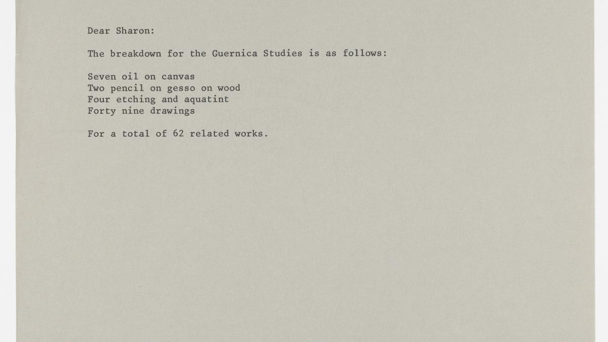 Eloise Ricciardelli, responsable de Registro del Museum of Modern Art de Nueva York, envía a Sharon Zane el desglose de los 62 estudios de Guernica.
