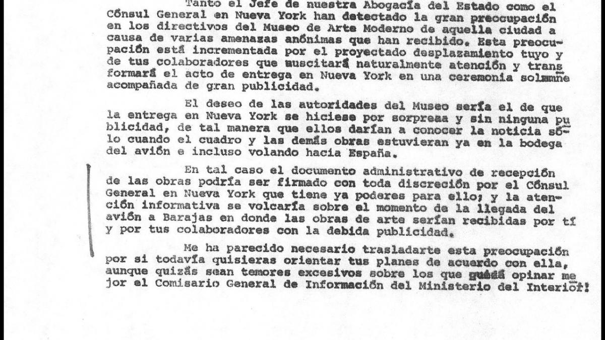 Comunicación para Íñigo Cavero, ministro de Cultura, acerca de que el Museum of Modern Art de Nueva York quiere realizar el traslado del cuadro con la mayor discreción posible por motivos de seguridad.