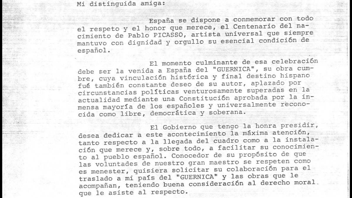 Adolfo Suárez, presidente del Gobierno de España, se dirige a Jacqueline, Paloma, Bernard, Maya y Marina Ruiz Picasso para pedir su colaboración en el traslado de Guernica a España.