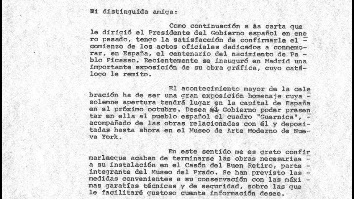 Íñigo Cavero, ministro de Cultura, invita a Maya, Claude, Paloma, Marina, Jacqueline y Bernard Picasso a la inauguración de la presentación de Guernica al pueblo español en el Casón del Buen Retiro.