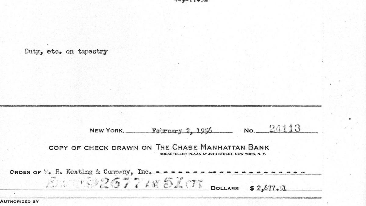 Cheque de Nelson Rockefeller a W. R. Keating & Company por el envío del tapiz