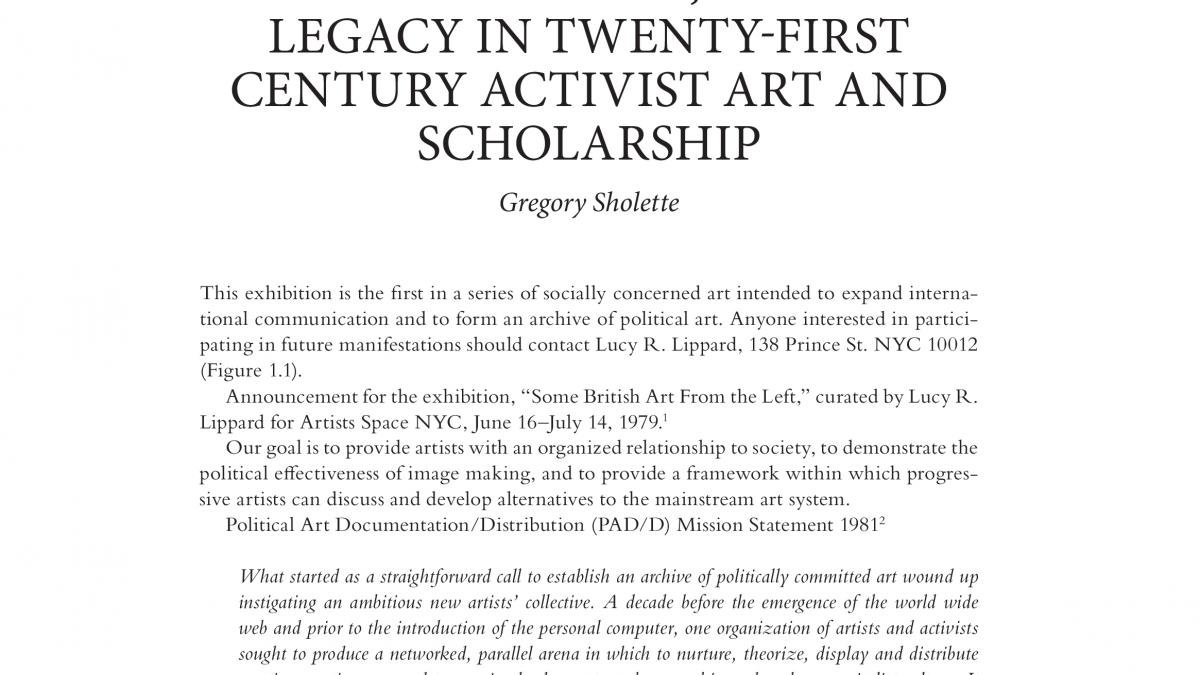 Esta historia del Political Art Documentation and Distribution (PAD/D) fue escrita por Gregory Sholette, uno de sus miembros más jóvenes, con el fin de proporcionar un “archivo” de sus actividades desde dentro del propio colectivo. Su experiencia con el PAD/D le llevó a argumentar que en el arte activista y en la esfera contra-pública existe la necesidad de un archivo de “materia oscura”, que él tradujo en una plataforma digital de acceso abierto a prácticas desconocidas o no representadas del mundo del arte. En su libro Dark Matter: Art and Politics in the Age of Enterprise Culture [Materia oscura. Arte y políticas en la era de la cultura de empresarial (Pluto Press, Londres, 2011)], Sholette interpela a la masa de productores ocultos “invisibles principalmente para aquellos que reclaman la gestión e interpretación de la cultura: críticos, historiadores del arte, coleccionistas, galeristas, museos, curadores y gestores de arte”. Estos puntos de vista están en deuda con los colectivos activistas y las manifestaciones en las décadas de 1960 y 1970, como la Artists and Writers Protest (AWP), el grupo Angry Arts, el Guerrilla Art Action Group (GAAG) o la Art Workers’ Coalition (AWC). También se nutren de los legados de las organizaciones feministas, como las Women Artists in Revolution (W.A.R.) o el Heresies Collective, y de aquellas surgidas a raíz de la marginación de los artistas negros, como las Women Students and Artists for Black Art Liberation (WSABAL).