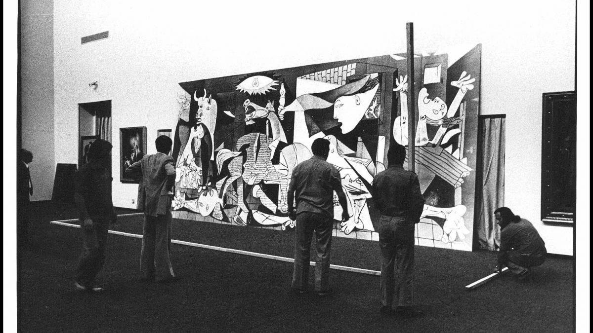 Colocación de la reproducción de Guernica para la prueba de instalación en el Casón del Buen Retiro