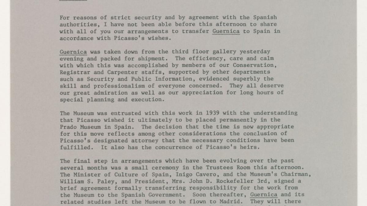 Comunicado interno de Richard Oldenburg, director del Museum of Modern Art de Nueva York, sobre la marcha de Guernica