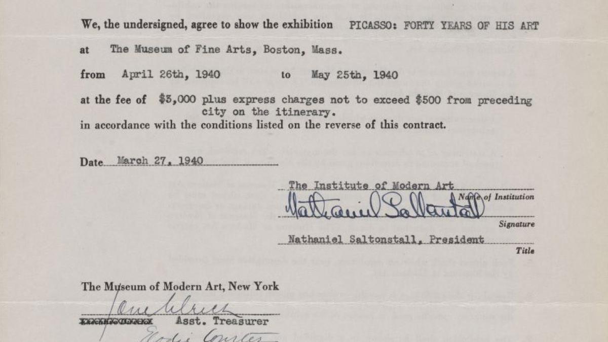Contrato de la exposición itinerante Picasso: Forty Years of His Art entre el Museum of Modern Art y el Institute of Modern Art de Boston